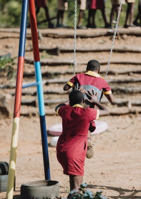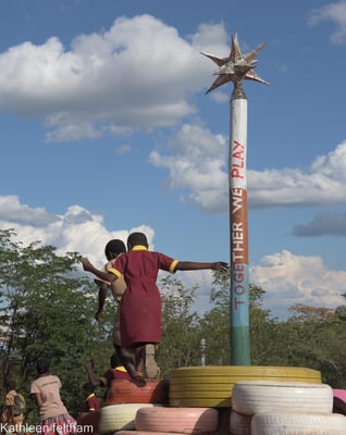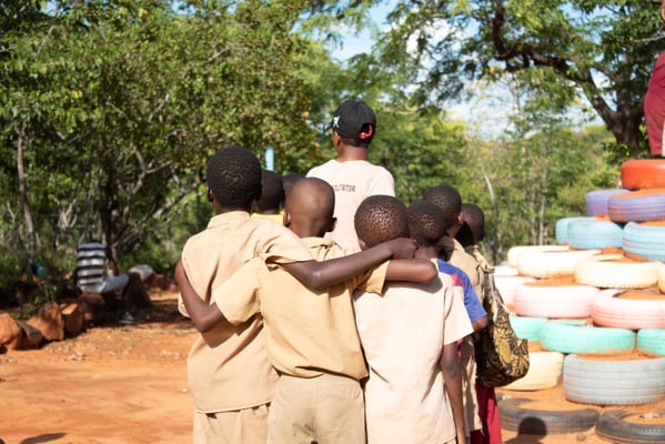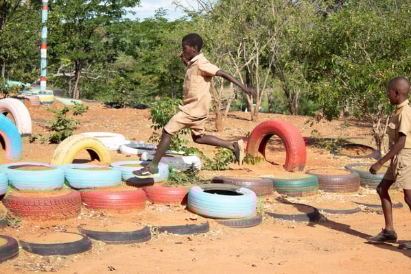 In a true labour of love, TNT and Ronnie of Ruoko Project and friend of the Foundation, Sylvie have spent months turning a section of rocky, barren ground into a colourful world of fun and imagination. Starting by moving thousands of stones by hand, the team created a safe space in which to play, then worked together to construct a recycled playground, made with used tyres and spare building materials donated. Bit by bit the space transformed, as fantastical birds appeared in trees, mountains of colourful steps grew, swings were set up and recycled tyre motorbikes and trikes were made, ready to race in imaginations. This magical world is now open to the children of the community every day but sees the most joy in the school holidays, when volunteers teach songs and drumming and lead children on an adventure in smiles, laughter and song. We give a huge thank you to our volunteer artists and Foundation friends for their donated time and creative skills that bring such joy and their continued dedication to enhancing this space the Batoka Playground.