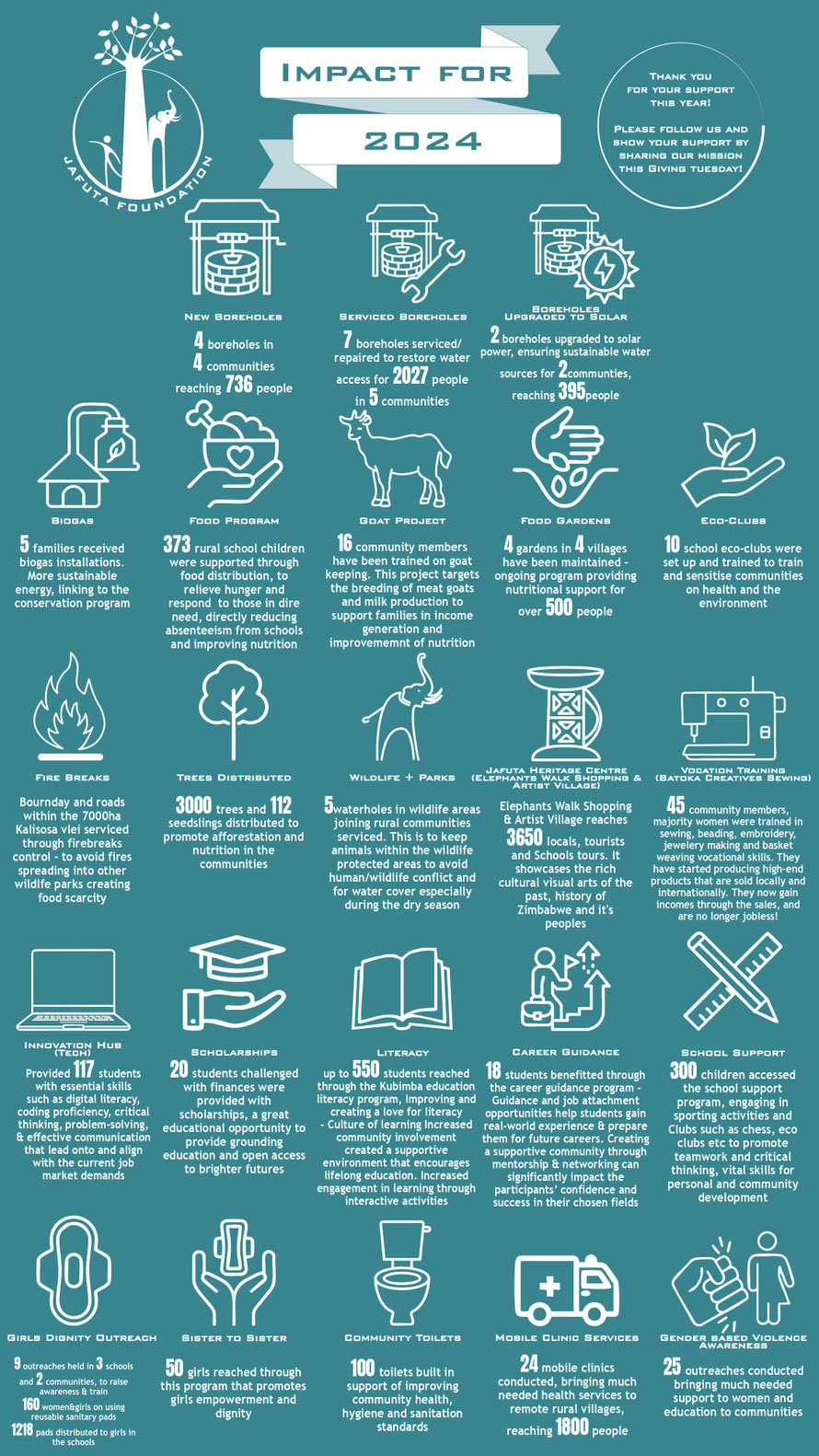 These are just some of the rural community works we have undertaken in this year alone, but most importantly of all, together with you, we create Hope. We give Hope where there was none before and this is thanks to you - the incredible support base and friends of the Jafuta Foundation!